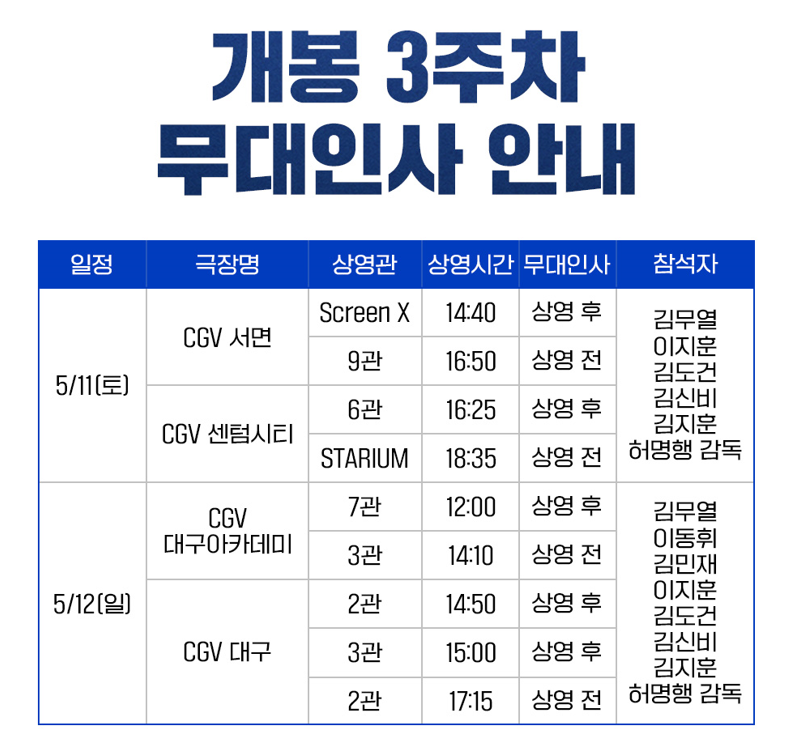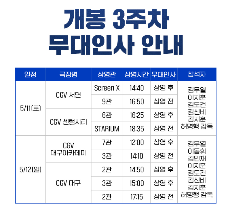 이번 '범죄도시 4' 시사회는 5월 11일과 12일 이틀 동안 경상도권 (대구와 부산)을 찾아갑니다. 상영관과 시간은 다음과 같습니다
