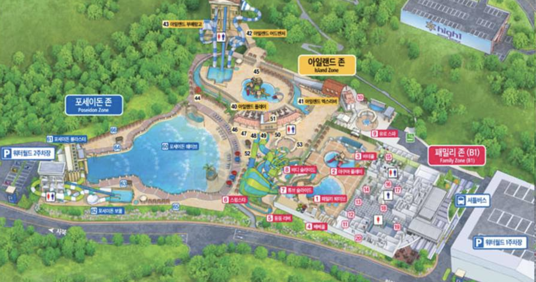 하이원 워터월드는 실내외 모두 다양한 시설을 제공하며, 주요 시설로는 웨이브 풀, 다양한 슬라이드, 그리고 여러 가지 체험을 할 수 있는 구역들이 있습니다. 특히, 포세이돈 존의 파도풀은 최대 2.4미터 높이의 파도를 제공하여 서핑을 즐기는 듯한 경험을 할 수 있습니다. 또한, 패밀리존에서는 가족 단위로 편안하게 즐길 수 있는 다양한 풀과 놀이기구가 마련되어 있습니다.
