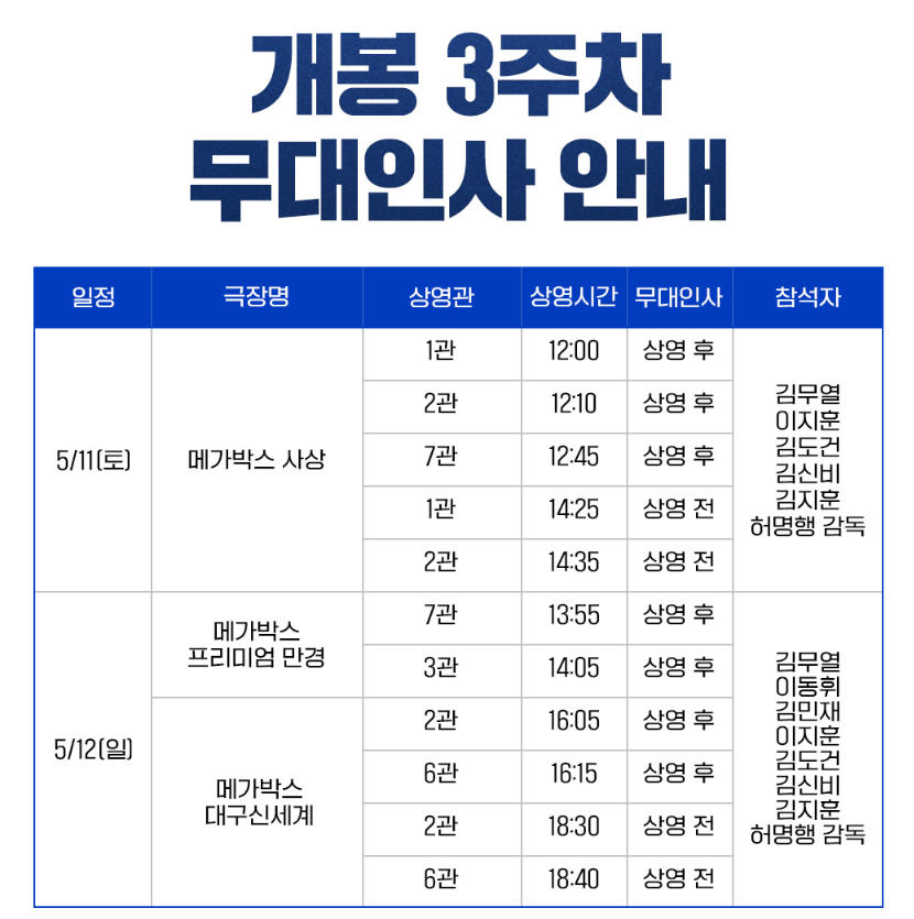 이번 '범죄도시 4' 시사회는 5월 11일과 12일 이틀 동안 경상도권 (대구와 부산)을 찾아갑니다. 상영관과 시간은 다음과 같습니다