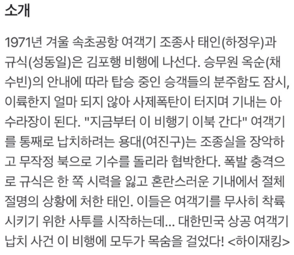 1971년에 실제로 발생한 대한항공 F27기 납북 미수 사건을 바탕으로 한 영화 '하이재킹'은 관객들에게 긴장감 넘치는 스릴을 선사합니다. 이 영화는 비행기 납치라는 극적인 소재와 함께 인간적인 드라마를 조화롭게 담아내며, 개봉 전부터 많은 기대를 모았습니다. 실제 사건을 바탕으로 했다는 점에서 더욱 몰입감을 느낄 수 있었고, 주연 배우들의 연기력 또한 빛을 발했습니다. 이번 리뷰에서는 '하이재킹'의 감상 포인트, 배우들의 매력, 그리고 영화에 숨겨진 비하인드 스토리에 대해 살펴보겠습니다.